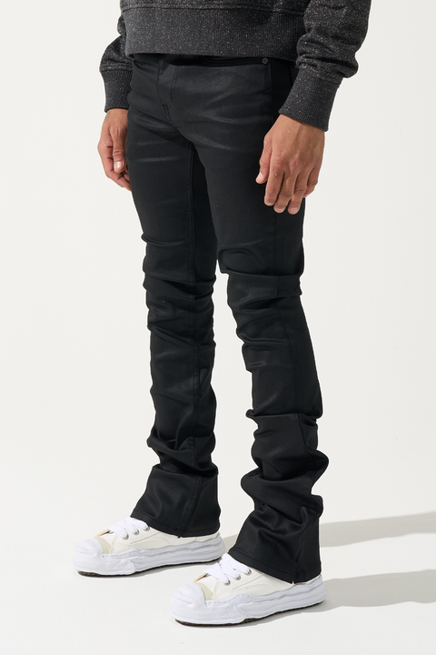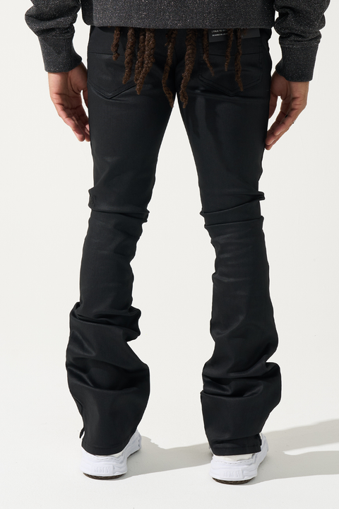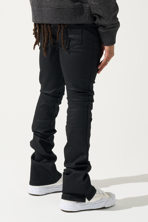 SERENEDE® CAVIAR Wax Stacked Jeans - Black denim with wax coating. Signature fitted construction, stacked finish. Deep black with premium wax coating and extended length.
