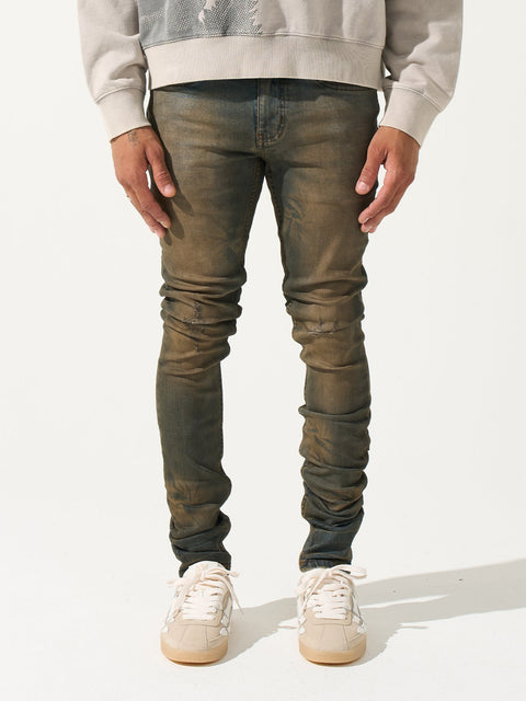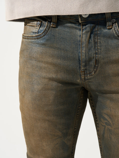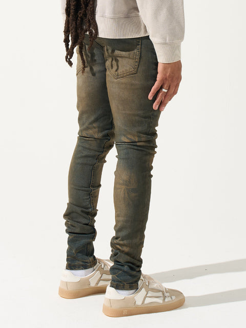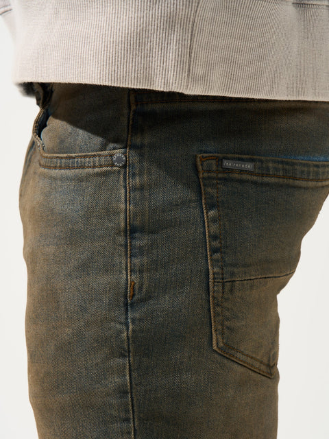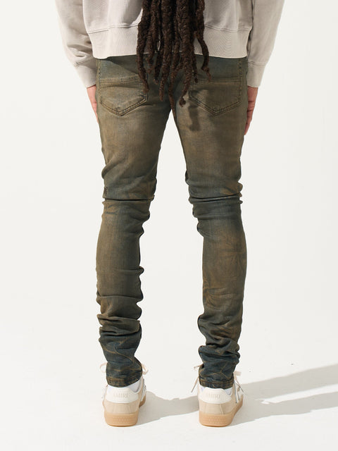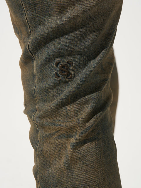 SERENEDE® OUD Jeans - Dark denim base with brown overdye wash. Fading and whiskering throughout, distress on both knees. Signature fitted construction with earth brown character.